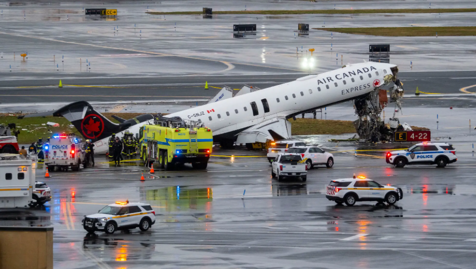 An Air Canada flight with more than 70 passengers aboard collided with a fire truck when landing at LaGuardia Airport in New York late on Sunday, killing the pilot, co-pilot, and injuring several.